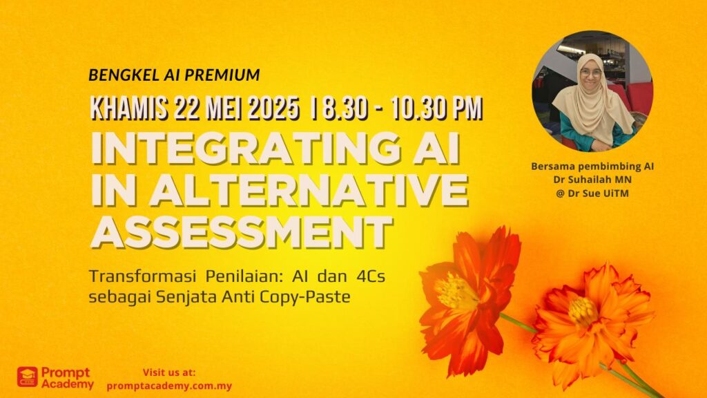 This premium workshop guided by Dr Suhailah MN (Dr Sue UiTM) explored the practical integration of AI tools into alternative assessment design. Targeted at educators navigating the post-ChatGPT landscape, the session emphasized transformative strategies to promote higher-order thinking and minimize academic dishonesty.