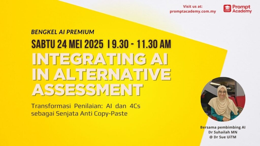 This Bengkel AI Premium, facilitated by Dr Suhailah MN (Dr Sue UiTM), focused on the practical integration of AI into alternative assessment — with a strong emphasis on designing tasks that resist copy-paste misuse.