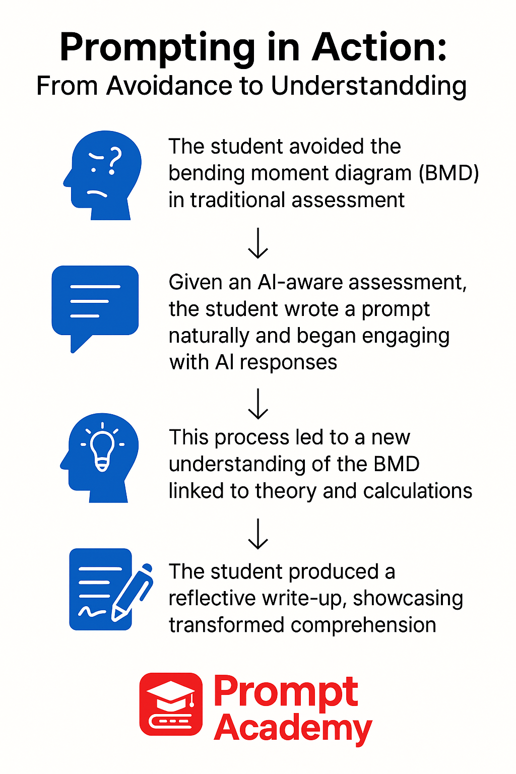 When students were given an AI-aware assessment, the task design indirectly embedded prompting techniques such as prompt chaining and chain-of-thought (CoT). Without being told what the techniques were, students naturally generated prompts while working through the task. They used AI tools like ChatGPT to explore ideas, ask questions, and clarify their understanding.